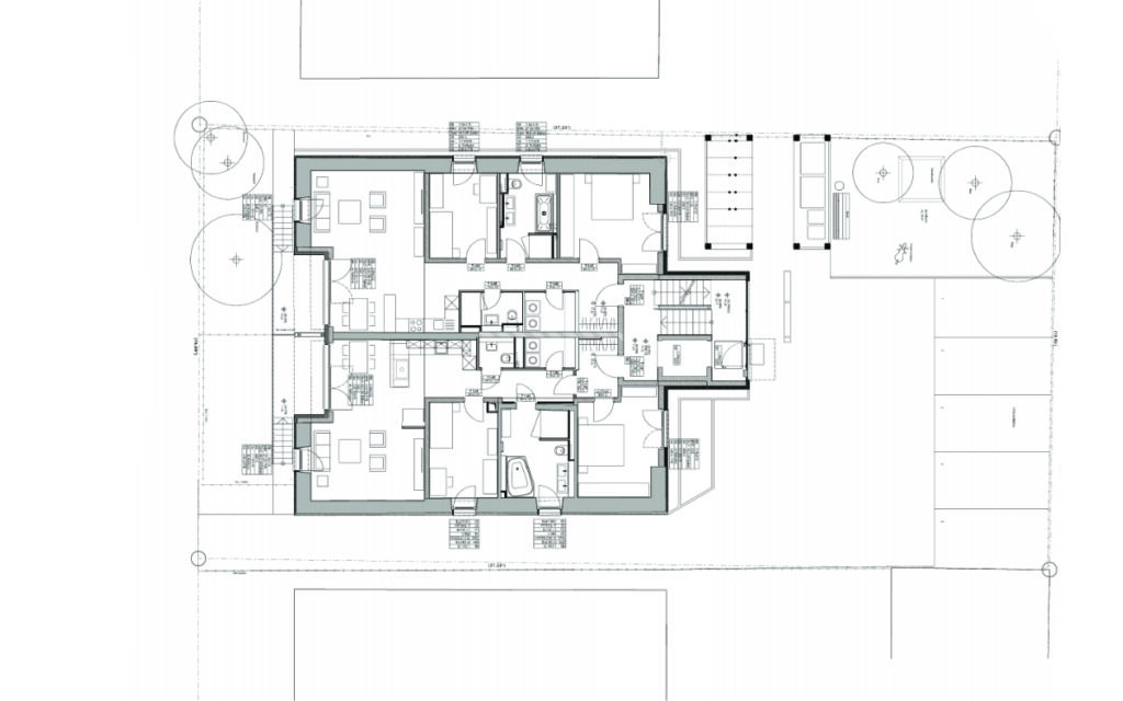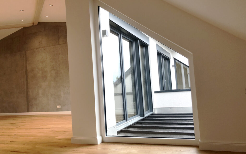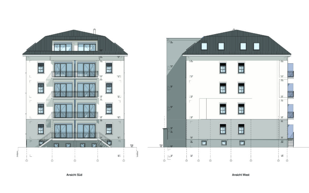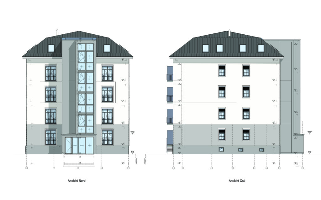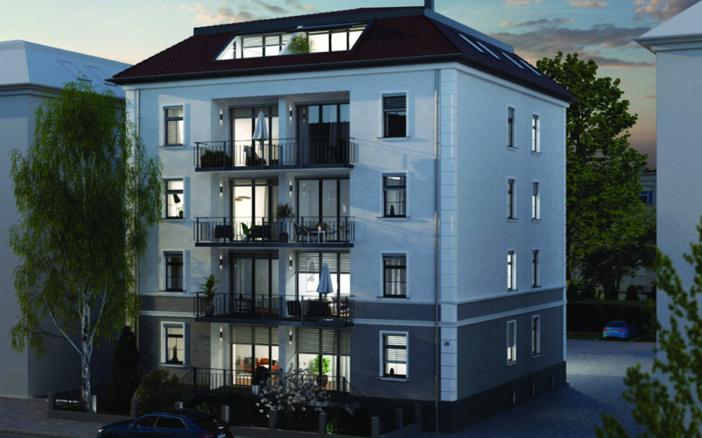 Die Wohnungen von Erdgeschoss bis 3. Obergeschoss erhalten jeweils eingeschnittene Balkone. Die beiden Wohnungen im Mansardgeschoss verfügen über Dachloggien.