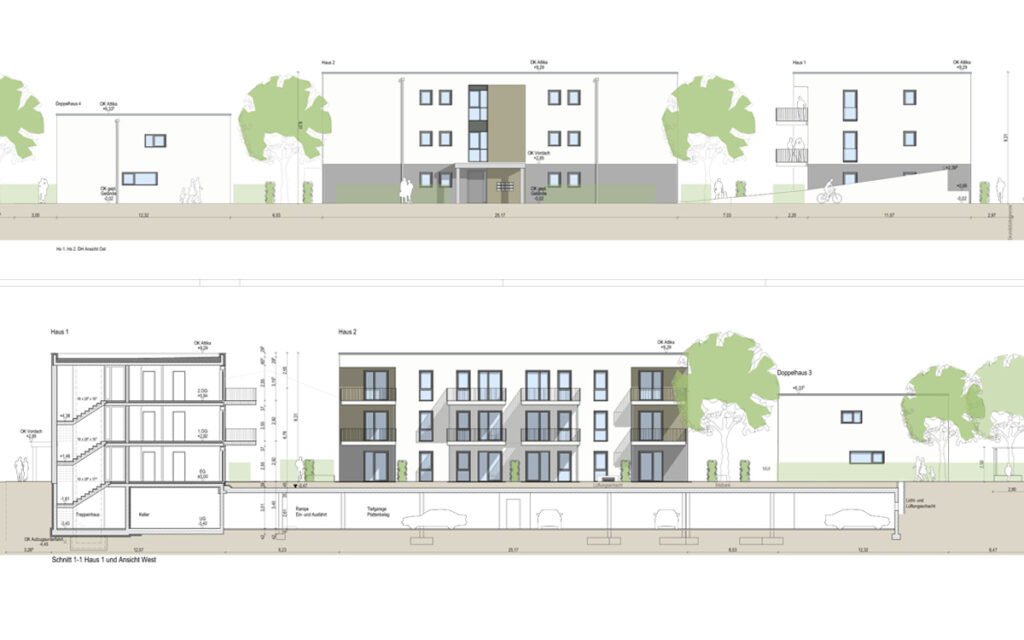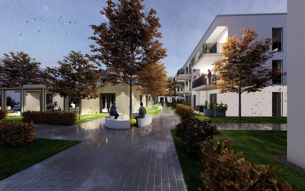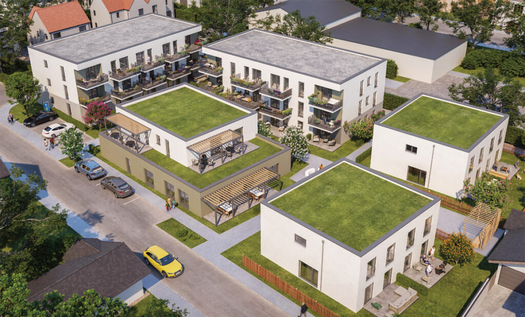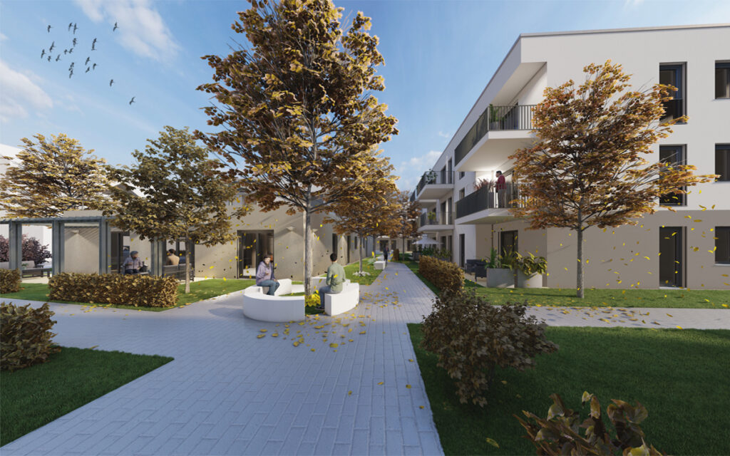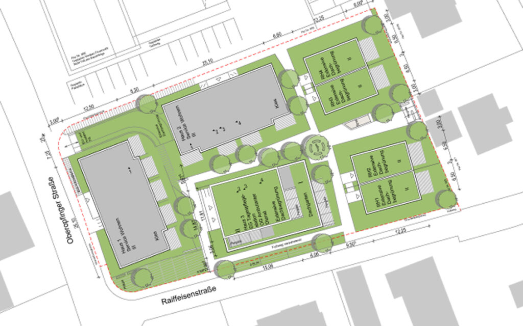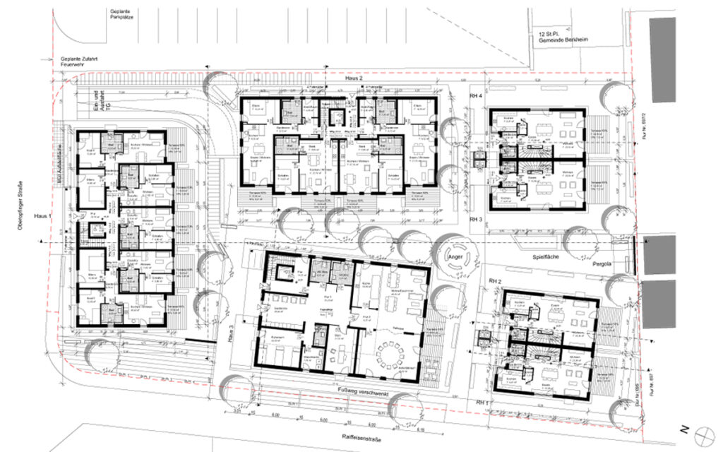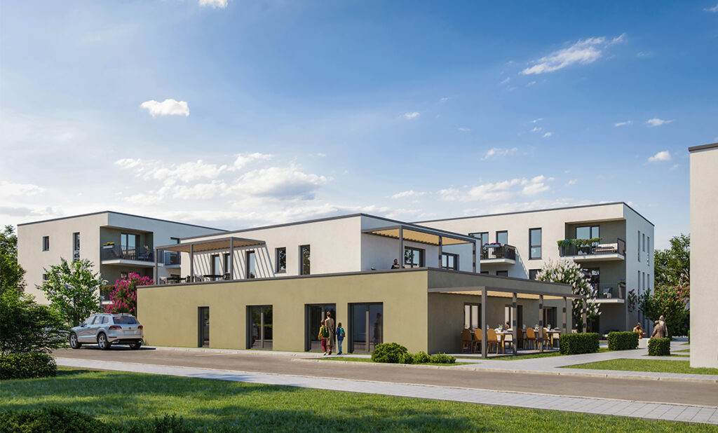 In Sichtweite der neu gestalteten Ortsmitte der Gemeinde Berkheim entsteht auf dem derzeit brachliegenden Gelände der ehemaligen Raiffeisenbank ein neuer Lebensmittelpunkt für Menschen aus mehreren Generationen und Lebenslagen. Angesprochen werden sowohl Senioren wie auch junge Familien wobei sich das Service Angebot nicht lediglich auf die Barrierefreiheit der 27 Wohnungen beschränkt. Passende und individuell zugeschnittene Service- und Betreuungsleistungen werden ebenso angeboten wie weiterführende Hilfestellungen. Das städtebauliche Konzept legt besonderen Wert auf die „Körnigkeit“ der Gebäude, deren Höhenstaffelung und die Einbindung in das umgebende Gefüge. Gleich einem Rückgrat sind die beiden 3-geschossigen Gebäudekörper des „Service-Wohnen“ entlang der nördlichen und östlichen Grundstücksränder positioniert. Als vermittelnde Elemente zu der bestehenden Einfamilienhausstruktur werden die 2- geschossigen Doppelhaushälften im südlichen Bereich der Gesamtanlage gesetzt. Im wahrsten Sinne des Wortes als „Herzstück“ dient das mittig gelegene Gebäude mit Gemeinschaftsbereich für alle Bewohner, einer Sozialstation und einer Tagespflegeeinrichtung für 12 Gäste. Der gesamte autofrei gestaltete Innenbereich des „Service Wohnen, Berkheim“ bietet vielfältigen Raum für Begegnung, Spiel und Kommunikation. Dieser Freiraum wird durch eine Tiefgarage ermöglicht, welche mit den insgesamt fünf Baukörpern verbunden ist.